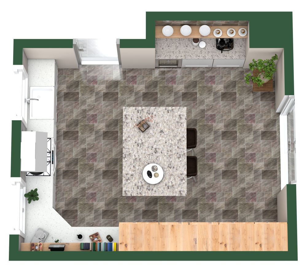 Manchmal sind die einfachsten Dinge auch die elegantesten. Dieser Grundriss für einer eleganten Küche mit Kochinsel besteht aus einem einzigen Raum mit drei großen Fenstern und einer rundherum u-förmigen Arbeitsfläche. Es gibt einen Herd, einen Backofen, einen an der Wand montierten Kamin, eine Spüle, viele Unter- und Oberschränke sowie einige Regale über dem Kopf. Auf diese Weise können Sie Ihre Töpfe und Pfannen in geschlossenen Schränken aufbewahren und trotzdem Ihr antikes Porzellan ausstellen. Außerdem ist die Arbeitsfläche groß genug, um all Ihre Küchengeräte unterzubringen – Grill, Waffeleisen, Mixer usw. Der moosgrüne Bodenbelag passt wunderbar zu den hellgrünen, gesprenkelten Arbeitsplatten, und ein paar Topfpflanzen vervollständigen den Effekt. Die Insel in der Mitte der Küche trägt zu ihrer Symmetrie bei und bietet zusätzlichen Platz zum Kochen und Essen. Sie werden es genießen, in diesem Raum zu kochen und eine schnelle Mahlzeit einzunehmen.