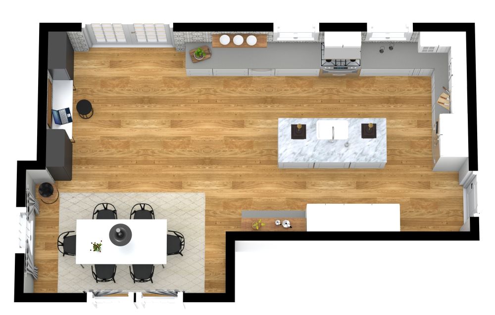 Es ist eine Herausforderung, einen zusätzlichen Raum zu haben, wenn sich Küche, Ess- und Wohnbereich am selben Ort befinden. Aber dieser Grundriss für eine geräumige L-förmige Küche mit Insel schafft genau das. Die Küche ist geräumig und verfügt über viele Arbeitsflächen, Schubladen, einen Herd mit einem an der Wand befestigten Kamin sowie eine Spüle. Sie können die Kücheninsel für die Zubereitung von Speisen und zum Essen gegenüber der Arbeitsplatte nutzen. In der gegenüberliegenden Ecke der Küche befindet sich eine L-förmige Sitzgelegenheit, die Platz für fünf Personen bietet. Vier Fenster, die über die Theke hinausgehen, machen den Raum hell und lebendig. Neben dem Wohnzimmer befindet sich ein weiteres Fenster mit einem innenliegenden Sims.