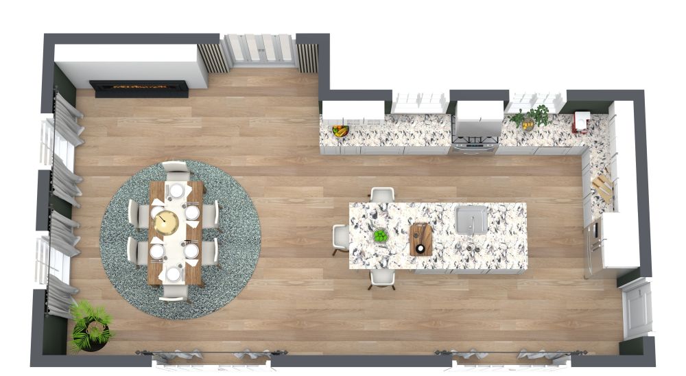 Dieser offene, luftige und einladende Grundriss für eine schöne Küche mit Kücheninsel und Kamin ist ebenso komfortabel und funktionell wie stilvoll und einladend. Der Küchenbereich verfügt über großzügige Arbeitsflächen, moderne weiße Schränke und eine große Mittelinsel, die sich perfekt zum Kochen der Lieblingsgerichte Ihrer Familie, zur Bewirtung von Gästen oder einfach zum Treffen mit Freunden auf einem Barhocker eignet. Die Küche geht nahtlos in einen geräumigen Essbereich über, in dem sich eine Vielzahl von Möbeln und Stilen unterbringen lässt. Als wäre dieser Raum nicht schon prächtig genug, bildet ein schicker, überdimensionaler Kamin den Mittelpunkt des Raumes, der ihn mühelos modern und zugleich warm erscheinen lässt. Dank der vielen Fenster und der auffälligen Flügeltüren rechts neben dem Kamin fällt viel natürliches Licht in den gesamten Raum. Sie werden von der Vielseitigkeit, der Frische und dem visuellen Reiz dieses hellen, modernen Raums mit Kücheninsel und Kamin begeistert sein.