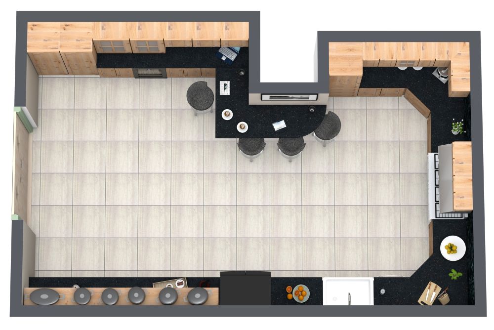 Ein großzügiger Grundriss und ein minimalistisches Design verbinden sich in dieser trendigen Küche mit Frühstückstheke. Glatte, matt schwarze Arbeitsplatten umrahmen die Küche und werden durch Schränke in natürlichen Holztönen schön ergänzt. In der linken Ecke der Küche befindet sich eine große Speisekammer. Auf der rechten Seite finden Sie einen eingebauten Weinkühlschrank, gefolgt von einer L-förmigen Frühstücksbar mit Sitzgelegenheiten für bis zu vier Personen. Noch mehr Stauraum und Arbeitsflächen erstrecken sich über die gesamte Küchenwand. Ein Herd mit Abzugshaube und ein Backofen erleichtern die Zubereitung hausgemachter Mahlzeiten. Eine tiefe, weiße Spüle verleiht dem Raum einen Farbakzent, und die freiliegenden Regale sind ein raffiniertes Designelement.