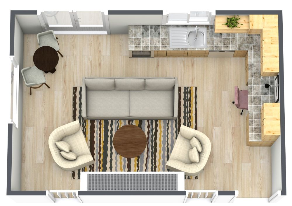 Diese L-förmige Küche mit Schreibtisch wurde mit Blick auf Komfort und Funktionalität entworfen und macht den Wechsel zwischen Arbeit und Freizeit zu einem Kinderspiel. Der Küchenbereich ist mit Edelstahlgeräten und auffälligen grauen und hellbraunen Fliesen ausgestattet, die nahtlos in einen geräumigen eingebauten Schreibtisch übergehen. Sowohl die Küche als auch der Bürobereich sind mit Naturholzschränken und -regalen ausgestattet, die eine helle, moderne Ästhetik schaffen. Die L-förmigen Arbeitsflächen maximieren die Größe des restlichen Raums, der viel Platz für ein Sofa, Sessel und ein kleines Kunstset bietet, wie hier zu sehen. Die weißen Wände und der helle Parkettboden lassen den Raum offen und einladend wirken, während die Fenster und Glastüren für viel natürliches Licht sorgen. Ein paar auffällige Accessoires wie ein bedruckter Teppich und ein schicker Bürostuhl runden das Gesamtbild ab. Mit diesem erfrischend stilvollen und funktionalen Raum kann man nichts falsch machen.