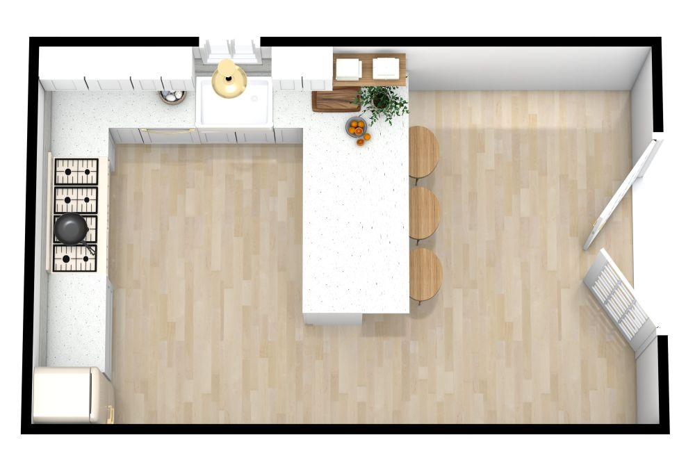 Klassische Flügeltüren öffnen sich zu dieser Küchenhalbinsel mit Sitzgelegenheiten, wo Sie eine umlaufende Arbeitsplatte mit Platz für eine Bar finden. In der einen Ecke der Küche befindet sich ein stilvoller Retro-Kühlschrank. Auf der rechten Seite erstrecken sich glatte Arbeitsflächen, die mit einem beeindruckenden Herd und einem Backofen zum Kochen Ihrer Lieblingsgerichte verbunden sind. Eine weitere Arbeitsfläche mit einer tiefen Spüle und einer goldenen Hängelampe darüber befindet sich in der anderen Küchenecke und erstreckt sich vor einem lichtdurchfluteten Fenster. Unter den Arbeitsplatten sowie darüber, in den Hängeschränken gibt es genügend Stauraum. Zudem können Sie über der Bar auf dem schwebenden Holzregal Ihre kleine Lieblingspflanze aufstellen. Eine Besonderheit bietet die hängende Arbeitsplatte mit Hochstühlen, wo drei Personen Platz finden und macht diese Küche definitiv zu einem idealen Ort für zwanglose Zusammenkünfte.
