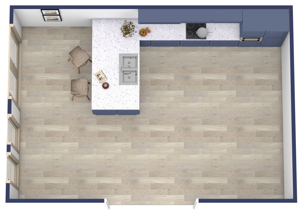 Wenn Sie ein minimalistischer Mensch sind, dann könnte dieser Grundriss für eine L-förmige Küche mit Halbinsel genau das Richtige für Sie sein. Hier stoßen Sie nicht mit Möbeln zusammen, sondern stattdessen können Sie den großzügigen Parkettboden und das natürliche Licht genießen, das durch die drei Fenster einfällt. Die Küche verfügt über eine große Arbeitsfläche und eine Halbinsel mit einem Doppelspülbecken. Außerdem gibt es einen Herd, einen zweitürigen Kühlschrank sowie Unter- und Oberschränke. Die Schränke und der Kühlschrank sind in einem Mittelblau gestrichen, das einen schönen Kontrast zu den beigen Hartholzböden bildet. Sie können auch beigefarbene Stühle auf die eine Seite der Halbinsel stellen, um einen Ess- und Loungebereich zu schaffen. Dies ist ein großartiges Layout, wenn Sie eine schlichte und übersichtliche Einrichtung bevorzugen.