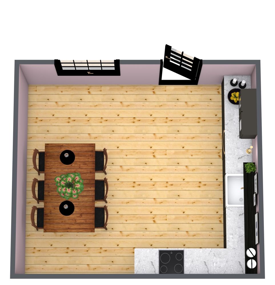 In diesem rosa und schwarzen L-förmigen Küchengrundriss finden Sie ein dynamisches Farbschema und viel Platz zum Essen. Natürliche Hartholzböden verleihen dem Raum ein raffiniertes Ambiente, während lilafarbene Wände einen schönen Kontrast zu den schwarz gerahmten Fenstern bilden. Eine lange, L-förmige Marmortheke erstreckt sich entlang der Rückwand der Küche über eine Ecke, wo sich ein Elektroherd und ein Ofen befinden. Schwarze Hängeschränke fügen sich in das Farbschema des Raums ein, während ein schwarzes Regal offenen Stauraum für Küchenutensilien oder Pflanzen bietet. In der Mitte der Arbeitsfläche befindet sich ein tiefes, weißes Waschbecken mit einer goldenen Pendelleuchte darüber. In der Mitte des Raums ist Platz für einen großen Esstisch, an dem sechs oder mehr Gäste Platz finden.