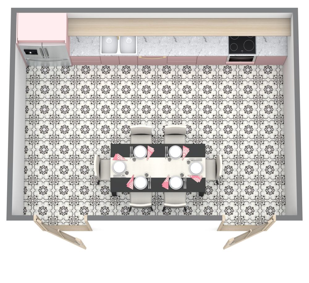 Zeitgemäß, schick und unverkennbar feminin wirkt diese rosa Küchenzeile ebenso auffällig wie einladend. Zwei helle Holztüren bilden einen schönen Eingang an einer der weißen Wände des Raums. Der offene Grundriss ist geräumig genug, um eine Kochinsel oder eine Vielzahl von Sitzgelegenheiten unterzubringen, darunter einen dezenten grauen Esszimmertisch und moderne Lederstühle. Der wunderschön geflieste Boden dieser Küche ist definitiv ein Hingucker, der mit einem kühnen schwarz-weißen Blumenmuster verziert ist. Gegenüber der beiden Türen reihen sich zartrosa Schränke an den Wänden auf, die mit atemberaubenden Marmorarbeitsplatten gepaart sind und viel Platz zum Kochen und Bewirten bieten. Goldfarbene Beschläge an der Spüle und dem Geschirrspüler vervollständigen die elegante Ausstrahlung des Raums, während ein langes, schwebendes Regal über der Theke zusätzlichen Stauraum bietet. Dieses Wohndesign wird Ihre Gäste beeindrucken und Ihrem Zuhause Persönlichkeit verleihen!