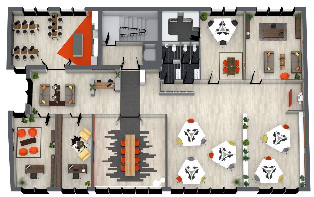 In diesem Grundriss für ein zeitgenössisches Büro finden Sie eine komfortable und einladende Atmosphäre für Kreativität und Austausch. Wenn Sie die Lobby betreten, finden Sie eine Rezeption und einen gemütlichen Wartebereich mit zwei Sofas. Im Anschluss an den Wartebereich finden Sie zwei große Büros, die ausreichend Platz für kleine Besprechungen bieten, sowie eine Küche und einen Essbereich mit Hochstühlen und langen Tischen. Der zentrale Sitzungssaal auf der linken Seite ist mit einem langen Besprechungstisch ausgestattet, an dem zehn Personen Platz finden. Die Toiletten befinden sich zentral neben dem Haupteingang, und ein großer Co-Working-Bereich mit fünf Tischen bietet Raum für zwanglose Zusammenarbeit. Neben dem Co-Working-Raum befindet sich ein weiterer gemeinsam genutzter Büroraum, und in der hinteren Ecke wartet eine große Chefetage mit einem zentralen Schreibtisch und einer bequemen Sitzecke mit zwei Sofas.