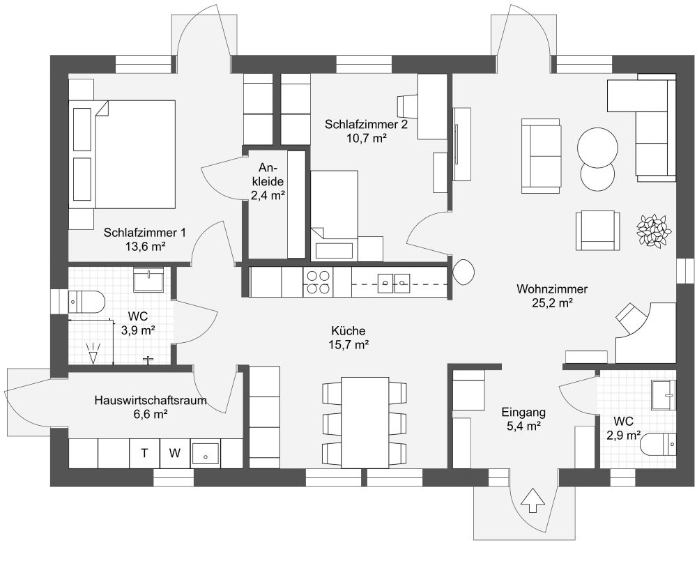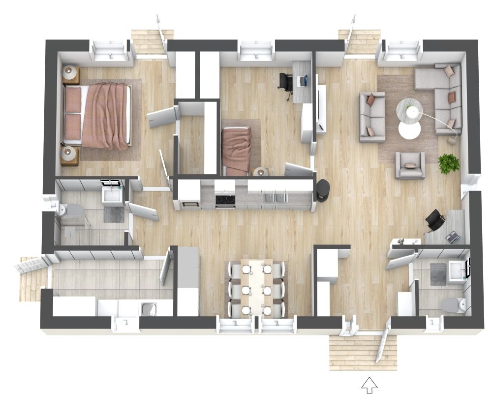 Der Smultronstället 94 Grundrisse besticht durch seine durchdachte Raumaufteilung, die jeden Quadratmeter optimal ausnutzt. Sobald Sie durch die Haupteingangstür treten, empfängt Sie ein einladendes Foyer, ausgestattet mit Regalen und Schränken – ideal für Handtaschen, Schuhe oder Rucksäcke. Rechter Hand befindet sich ein kompaktes, aber funktionales Bad mit Waschbecken und Toilette. Das großzügig geschnittene Wohnzimmer lässt genug Platz für eine gemütliche Sofalandschaft und bietet darüber hinaus Raum für beispielsweise einen Schreibtisch, ein Klavier oder andere Lieblingsstücke. Eine Tür vom Wohnzimmer aus gewährt Zutritt zu einer optionalen Terrasse oder einem idyllischen Innenhof. Die Küche begeistert mit einem vollwertigen Kühlschrank, einer praktischen Speisekammer, einem Herd, einem Doppel-Backofen, einer Spüle und weiterem Stauraum in den Hängenschränken. Eine geräumige Waschküche mit zusätzlichem Stauraum, Waschbecken, Waschmaschine und Trockner verfügt auch über eine Tür, die den direkten Zugang nach draußen ermöglicht – perfekt, um Wäsche im Freien zu trocknen. Das Hauptschlafzimmer punktet mit einem großzügigen begehbaren Kleiderschrank und Platz für eine zusätzliche Garderobe oder Kommode. Eine weitere Tür führt direkt zu einem Außenbalkon oder einer Terrasse. Das etwas kompaktere zweite Schlafzimmer ist vielseitig einsetzbar, sei es mit Etagenbetten für die Kleinen, einem gemütlichen Bett für Gäste oder als Büro- bzw. Bastelraum.