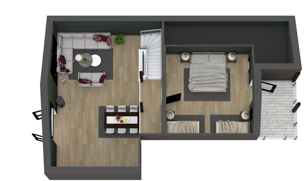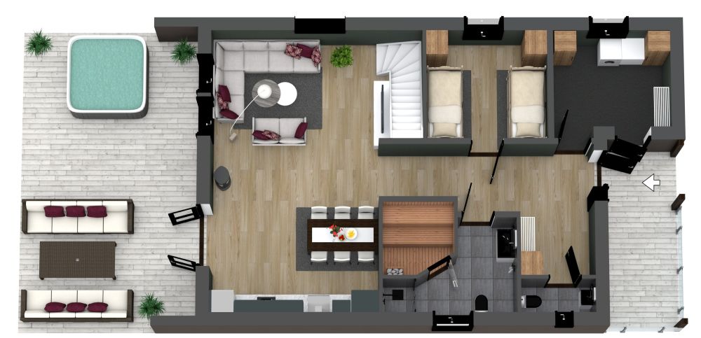 Betrachten Sie diesen durchdachten Harmoni 108 Grundrisse, ideal als Ferien- oder Strandhaus, mit zwei Schlafzimmern und sowohl einem großen als auch einem kleineren Bad. Schon beim Betreten des Hauses sticht der rechts gelegene Hauswirtschaftsraum ins Auge, ergänzt durch einen Abstellbereich für nasse oder sandige Utensilien. Die einladende Diele bietet zusätzlichen Stauraum und ein Gästebad. Weiter im Flur befindet sich ein Schlafzimmer, ausgestattet mit Etagenbetten für bis zu vier Personen. Ein benachbartes großzügiges Bad begeistert mit Waschbecken, Toilette, Dusche und einer beeindruckenden Sauna - ein echtes Highlight dieses Hauses. Der Hauptwohnbereich besticht durch sein offenes Konzept: Eine einwandige Küche, ein großer Esstisch und ein gemütlicher Sitzbereich. Große Fenster fluten den Raum mit Licht und bieten einen herrlichen Ausblick. Von hier aus öffnen sich Glastüren zu einer geräumigen Terrasse, die mit Sitzmöglichkeiten und optional einem Whirlpool zum Verweilen einlädt. Im Obergeschoss erwartet Sie ein großzügiges zweites Schlafzimmer, das flexibel gestaltet werden kann, um weitere vier Gäste komfortabel unterzubringen.