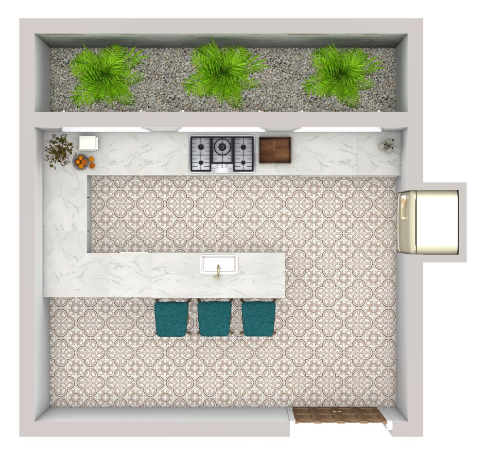 Filigrane Fliesenböden und luxuriöse Arbeitsplatten im Marmorstil bilden die Kulisse für diese moderne Küche mit Halbinsel im tropischen Stil. Betritt man die Küche durch Flügeltüren, findet man eine große, U-förmige Arbeitsplatte vor, die sich um den ganzen Raum herum erstreckt. Sie bietet Sitzgelegenheiten im Bar-Stil für drei Personen, viel Fläche für die Zubereitung von Mahlzeiten sowie eine Kaffeestation. Ein klassisches, weißes Spülbecken mit Armaturen aus Kupfer befindet sich vor den Hochhockern. Dahinter befinden sich ein Gasherd und ein Ofen sowie Platz für ein großes Schneidebrett. Drei Fenster bilden die Rückwand der Küche und geben den Blick frei auf den begrünten Innenhof. An der Seitenwand steht ein Kühlschrank im Retrostil, der den Raum mit seinem einzigartigen Design abrundet.