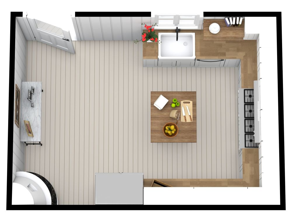 Schieferverkleidungen an den Wänden und warme, neutrale Farbtöne verleihen dieser U-förmigen Küche im Landhausstil eine gemütliche Ausstrahlung. Wenn man die Küche durch die Seitentür betritt, findet man einen Hartholzboden in einem gebrochenen Weiß, der durch neutrale Holztöne und weiße Schränke im Shaker-Stil gut ergänzt wird. Ein tiefes, weißes Spülbecken befindet sich direkt unter einem großen Fenster, so dass Sie beim Abwasch die Aussicht und das natürliche Sonnenlicht genießen können. Die Arbeitsplatten aus Naturholz sorgen für ein rustikales Aussehen und Gefühl und erleichtern das Schneiden sowie die Zubereitung von Mahlzeiten. In der Mitte der Rückwand befindet sich ein Herd mit Abzugshaube und dahinter eine zentrale Kücheninsel mit weiteren Arbeitsflächen für die Zubereitung von Mahlzeiten oder als zwangloser Treffpunkt für Gäste. Der Raum bietet ausreichend Platz für einen Doppelkühlschrank und einen kleinen Präsentationstisch an der Rückwand.