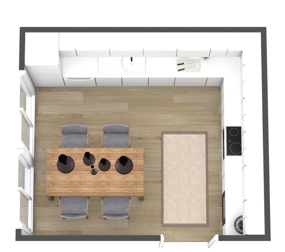 Wenn es darum geht, einen Wohnraum zu gestalten, der sowohl modern als auch einladend wirkt, kann eine monochrome Farbpalette eine große Wirkung erzielen. Die große L-förmige Arbeitsfläche der Küche bietet viel Platz zum Kochen sowie für zahlreiche Gäste, während die vielen weißen Schränke reichlich Stauraum für Geschirr, Küchenutensilien und vieles mehr bieten. Vier übergroße Fenster erstrecken sich neben dem Küchenbereich und erhellen den gesamten Raum durch viel natürliches Licht. Zeitgenössische Hartholzböden bringen Wärme und Persönlichkeit in den ansonsten neutralen Raum und passen wunderbar zu dem Esstisch aus Walnussholz sowie den grauen Stühlen mit Struktur. Ein zweifarbiger Teppich lockert den Platz vor dem Herd auf, während die hübschen schwarzen Leuchten über dem Essbereich die stilvolle Atmosphäre dieser modernen und einfarbigen L-förmigen Küche vervollständigen. Schlicht, raffiniert und komfortabel – in dieser modernen Küche wird man sich gerne aufhalten.