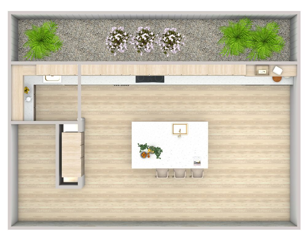 Die Möglichkeiten sind endlos in dieser Designidee für eine L-förmige Küche. Die vielen Quadratmeter ermöglichen es Ihnen, die Küche Ihrer Träume zu gestalten und zu dekorieren, und die Gartenlandschaft vor den Küchenfenstern sorgt für ein sonniges und helles Ambiente im Inneren. In der Mitte der Küche befindet sich eine große Kochinsel mit viel Arbeitsfläche, einem Waschbecken und Sitzgelegenheiten im Barhocker-Stil. An der Seite befindet sich eine geräumige, begehbare Speisekammer und entlang der Fensterfront finden Sie die gesamte Arbeitsfläche vor, die Sie benötigen. Bereiten Sie Ihre Lieblingsgerichte auf großen Schneidebrettern zu oder richten Sie eine Kaffee- oder Getränkestation in der Ecke ein. Ein großer Herd steht für all Ihre Kochbedürfnisse zur Verfügung. Zudem bieten zahlreiche Schränke über und unter den Arbeitsflächen großartigen Stauraum für Sie.