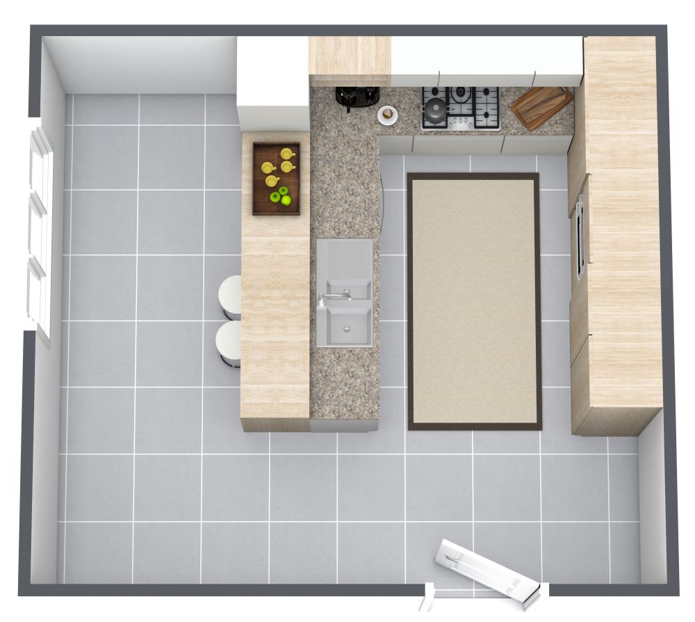 In dieser U-förmigen Küche mit Frühstücksbar finden Sie viel Platz zum Kochen und zum gemütlichen Essen. Neutrale Töne und schlanke, klare Linien verleihen Ihrer Küche ein modernes Aussehen und Gefühl. Die umlaufende Arbeitsplatte mit Sitzgelegenheiten im Bar-Stil bietet Ihren Gästen sowohl für das Frühstück als auch einen kleinen Snack vor dem Essen Platz. Wenn Sie durch die Küchentür treten, finden Sie einen weichen grauen Fliesenboden und eine L-förmige Arbeitsplatte aus Granit. Die gegenüberliegende Wand bietet reichlich Stauraum in Schränken und Speisekammern. An der Rückwand befinden sich ein Gasherd und ein Backofen. In der Mitte des Tresens befindet sich eine tiefe Spüle gegenüber der Frühstücksbar mit Platz für Hochstühle. Ein großes Fenster an der linken Wand des Raums bietet viel natürliches Licht, während zusätzliche Bodenfläche Platz für dekorative Grünpflanzen oder einen kleinen Esstisch bietet.