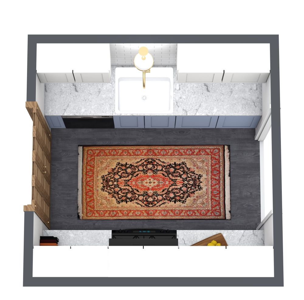 Wenn Sie nur einen kleinen Raum für die Küche in Ihrem Haus haben, können Sie mit dieser Idee für eine kleine zweizeilige Küche immer noch viele Funktionen erhalten. Auf beiden Seiten dieser Küche gibt es Arbeitsflächen, was bedeutet, dass Sie viel Platz zum Schneiden und Zubereiten von Speisen haben. Auf der einen Seite befindet sich ein Herd mit vier Kochfeldern und auf der anderen Seite eine Spüle. Auf beiden Seiten befinden sich Ober- und Unterschränke, so dass viel Stauraum vorhanden ist. Die Schränke sind weiß, die Arbeitsflächen aus weißem und grauem Marmor und der Fußboden aus Holzkohle – eine neutrale Basis für einige Farbtupfer. Sie können auf einer Seite eine getäfelte Holztür einbauen, einen Teppich im persischen Stil auf den Boden legen und eine dekorative Deckenlampe anbringen. Diese Akzente verleihen der Küche Persönlichkeit und machen sie lebendig.