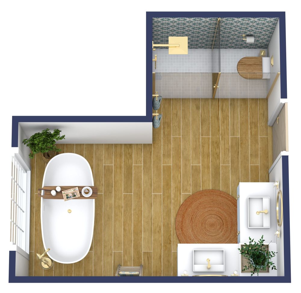 Dieses L-förmige Badezimmer im Strandstil strotzt vor Persönlichkeit und Charme und ist schön und hell. Strahlend weiße Wände und Hartholzböden bilden einen sauberen Hintergrund für den Raum, der mit weißen Geräten und goldgelben Armaturen geschmückt ist. Eine große Badewanne befindet sich direkt vor dem übergroßen Fenster. Rechts von der Tür stehen sich eine Dusche und eine Toilette gegenüber, die durch eine Glasscheibe getrennt sind. In diesem Bereich befinden sich hellgraue Fliesen und eine auffällige Wand in Teal. Zwei Waschbecken befinden sich auf beiden Seiten der Ecke, und über jedem hängt ein runder Spiegel. Ein paar Topfpflanzen lockern den Raum auf und sorgen für einen Hauch von Farbe. Dank des mühelosen Stils und des modernen Komforts wird es ein Vergnügen sein, sich in diesem Bad zu verwöhnen.